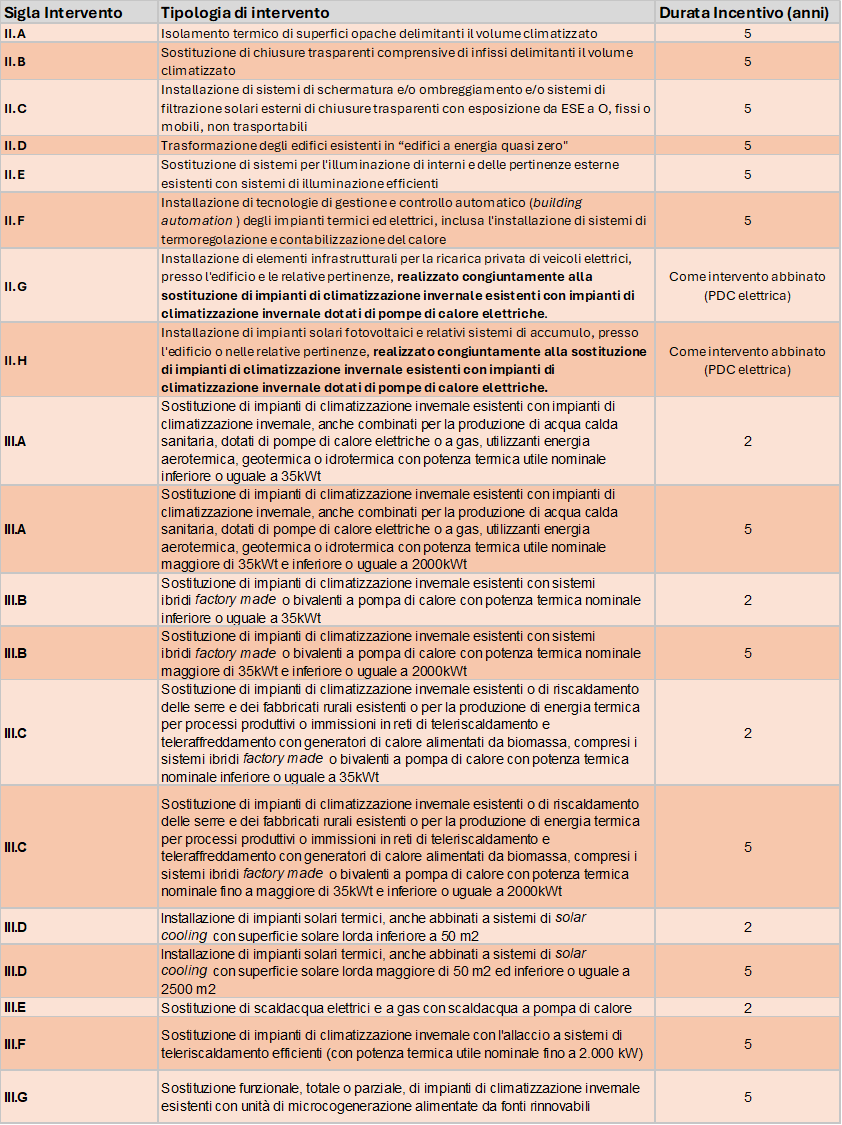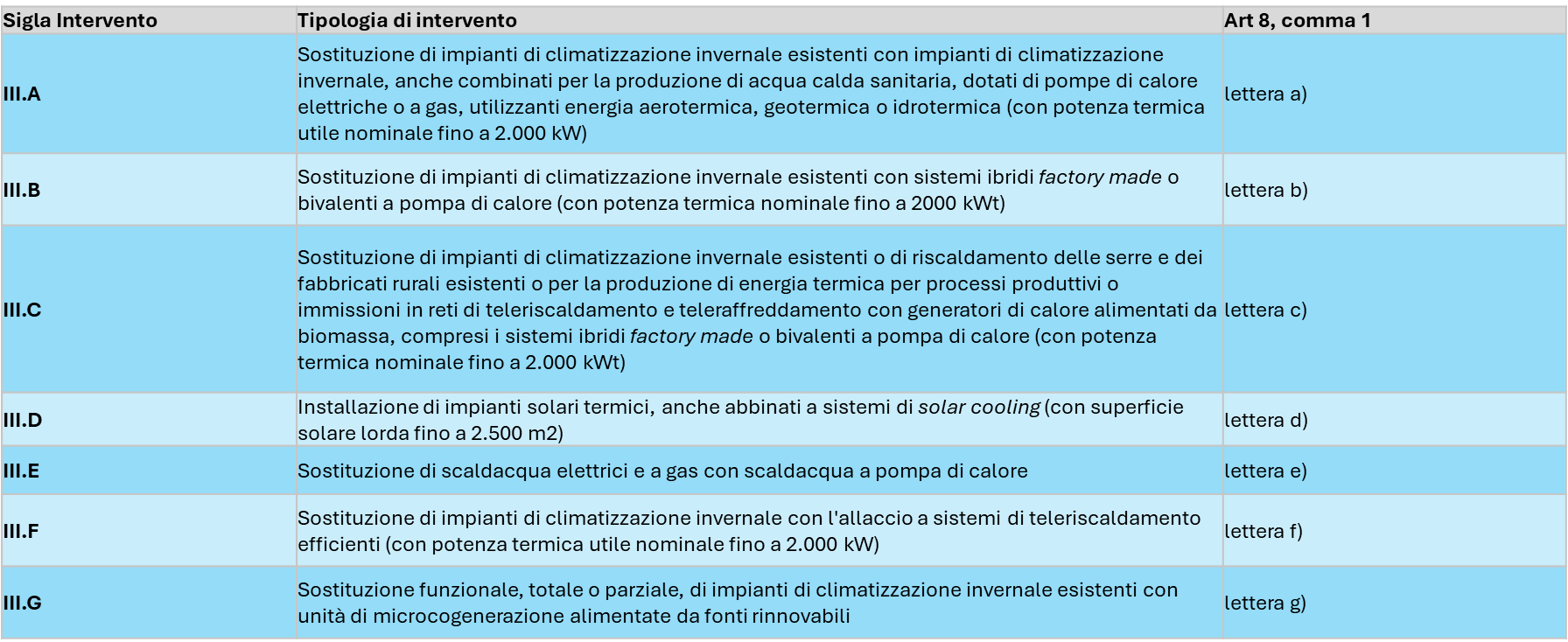 Gli interventi incentivabili previsti dal Conto Termico 3.0 sono suddivisi in: