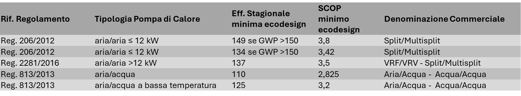 Sia la pompa di calore che il gruppo funzionale a condensazione devono rispettare i requisiti tecnici previsti nell'allegato 1 del decreto al capitolo 3.1 ed i requisiti espressi in tab. 6 sempre nell'allegato 1 del decreto. Sostanzialmente la caldaia a condensazione deve essere in classe A e la pompa di calore in funzione della sua tipologia deve avere un'efficienza stagionale ed uno SCOP pari o superiore ai requisiti di ecoprogettazione previsti nei regolamenti di prodotto ecodesign, calcolati in zona climatica “average” e stabiliti in funzione del tipo di prodotto e di applicazione.Requisiti prestazionali minimi gruppo funzionale a pompa di calore (paragrafo 3.1 allegato 1 del decreto)