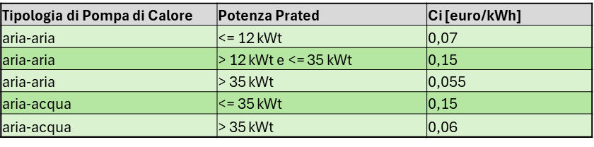Ci: coefficiente di valorizzazione dell'energia ad esempio 0,150 euro/kWh per Pot <= 35kW, PDC aria-acqua