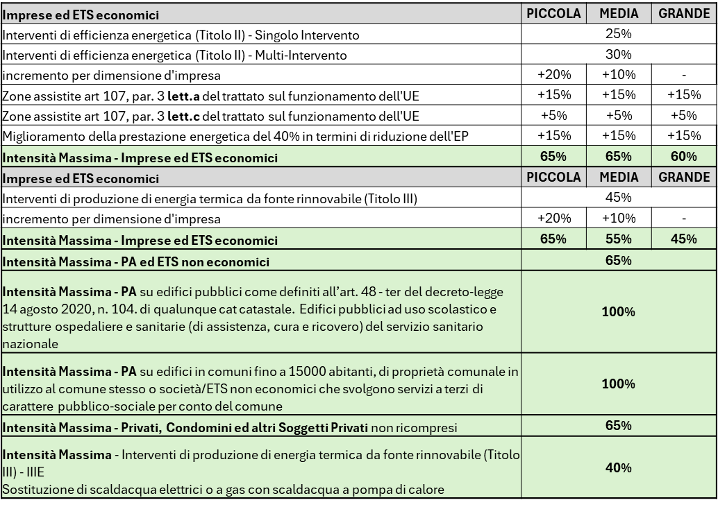 nota: Per i Soggetti Privati imprese e gli ETS economici si attuano le disposizioni specifiche per le imprese definite nel Titolo V del decreto e non sono ammessi gli interventi che prevedono l'installazione di apparecchiature energetiche alimentate a combustibili fossili, compreso il gas naturale