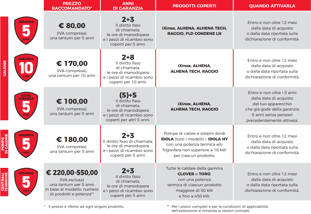 L'estensione della garanzia convenzionale sul prodotto copre il diritto fisso di chiamata, le ore di manodopera e i pezzi di ricambio.