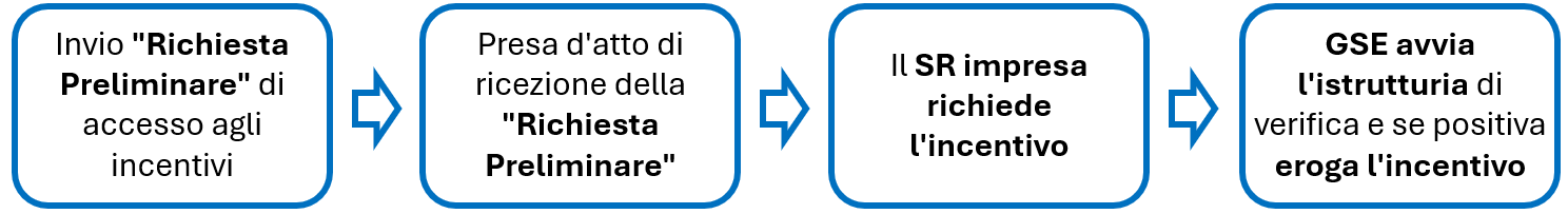 - Per formalizzare la richiesta di incentivo le imprese, prima dell'avvio dei lavori, hanno l'obbligo di effettuare la "Richiesta preliminare" di accesso agli incentivi" sul Portaltermico attraverso il modello 4. Il GSE risponderà via PEC attraverso una presa d'atto di ricezione della "Richiesta Preliminare". In tale richiesta, che NON costituisce una prenotazione dell'incentivo, dovrà essere presente•Denominazione/ragione sociale e categoria d'impresa (micro, piccola, media o grande) definibile secondo i criteri descritti nella Raccomandazione della Commissione Europea n. 361 del 6.5.2003 e nel D.M. 18 aprile 2005.