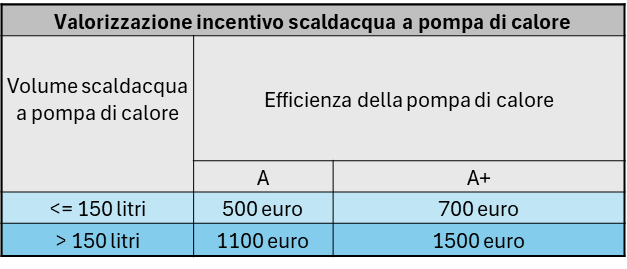 Per accedere all'incentivo lo scaldacqua a pompa di calore deve essere di classe energetica A o superiore secondo il Regolamento Europeo 812/2013. Il valore dell'incentivo dipende dall'effettiva classe energetica e dal litraggio dello scaldacqua